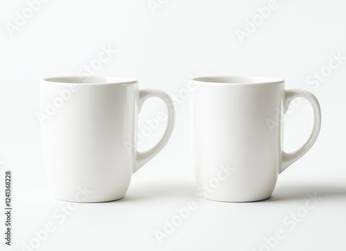White mug mockup, two mugs side by side on a white background, mock-up for design and print, high-resolution photography, high detail, stock photo, professional color grading, clear, sharp focus.