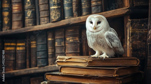 White Owl Perched on Antique Books with Copy Space in the Background. Generative Ai