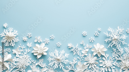 White paper snowflakes and flowers on a light blue background for winter decoration and crafts