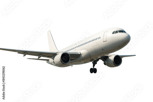 White passenger jet aircraft descending for landing, showing landing gear and engines, transparent background cutout