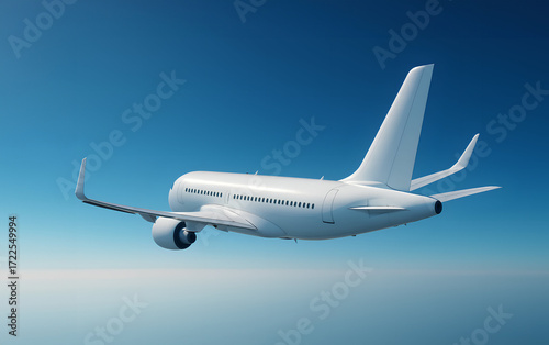White Passenger Jet Plane Two Engine Rear Back View Flying Over Blue Sky