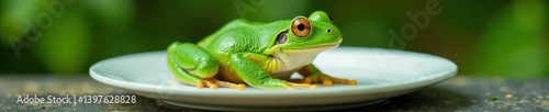 White plate with a large green frog sitting on it, nature, seafood