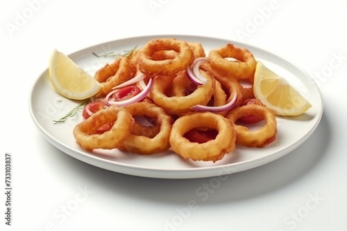White plate with fried calamar rings with lime slices on the white surface