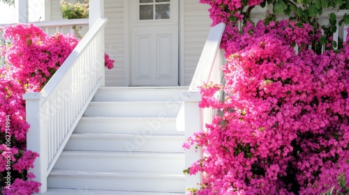 White porch steps with bright pink flowers blooming on each side of the steps.