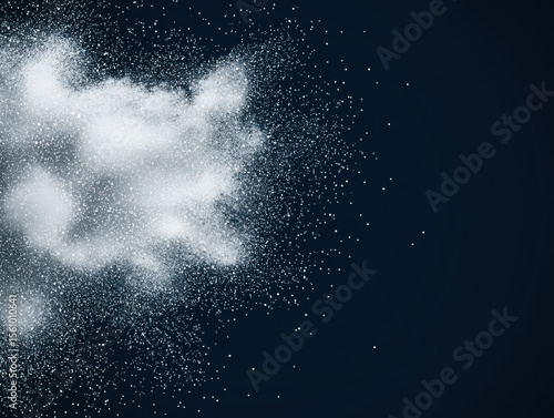 White powder disperses dynamically against a dark background, creating a cloud of fine particles scattering outward.