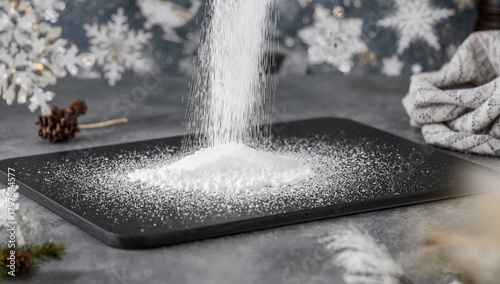 White powdered sugar cascades onto a dark mica surface, ideal for culinary presentation