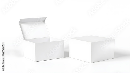 White product display boxes on white background one open, one closed clean and minimal packaging mockup