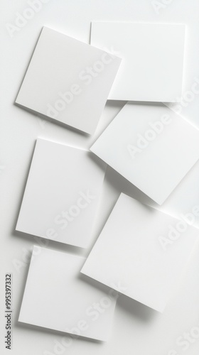 white rectangular blank 6 postcards lie spread out on desktop, realistic photo, view from drone, minimalism, simple, style, background white background
