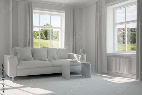 White room with sofa. Scandinavian interior design. 3D illustration