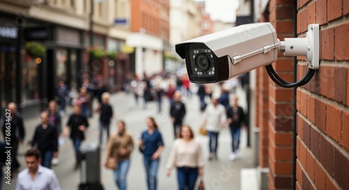 White security camera monitoring busy pedestrian street with blurred crowd background showcasing urban surveillance technology