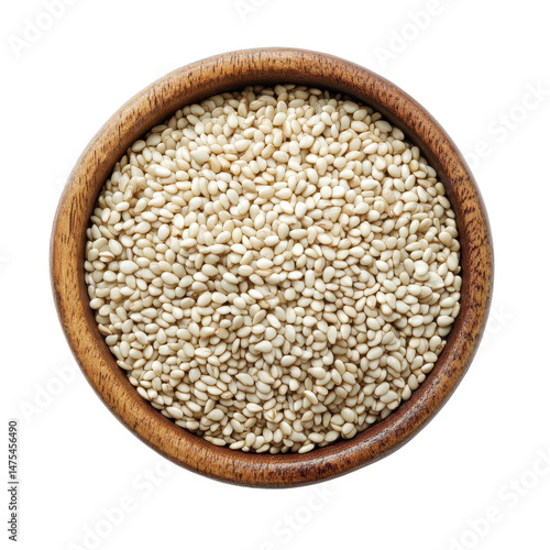 White sesame seeds in a wooden bowl isolated against a bright Transparent background for culinary use, White sesame in a bowl isolated on PNG background