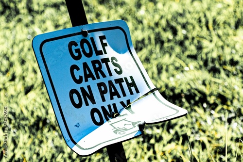 White sign with "GOLF CARTS ON PATH ONLY" written on it in faded black lettering