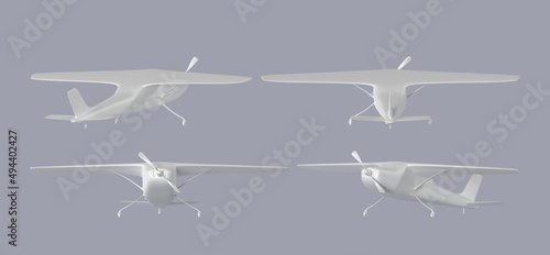 White small airplane front, back and angle view. Realistic mockup single engine propelled aircraft, private jet, civil aviation. Turboprop plane with vanes isolated on grey background, 3d render