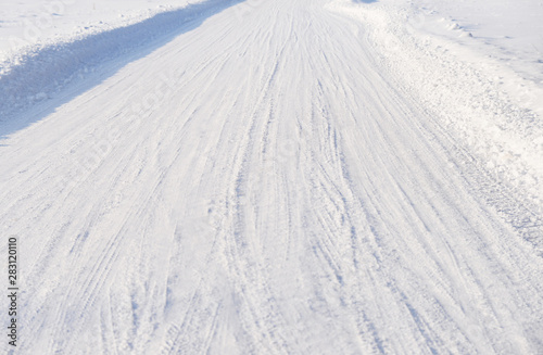 White snow road background of fresh snow texture - winter holiday, Merry Christmas, New Year concept. Empty road in winter covered with snow. Greeting card with copy space for text.