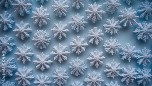 White snowflakes arranged in an organized pattern on a blue background for winter and holiday themes.