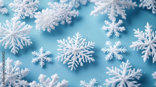 White snowflakes decoration lying on blue background creating winter atmosphere