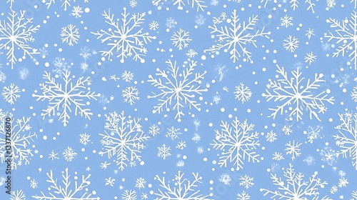White snowflakes falling on blue winter sky background for design, wallpaper or festive decoration