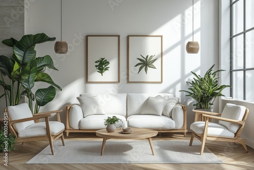 White sofa and armchairs in scandinavian style home interior design of modern living room, Generative AI