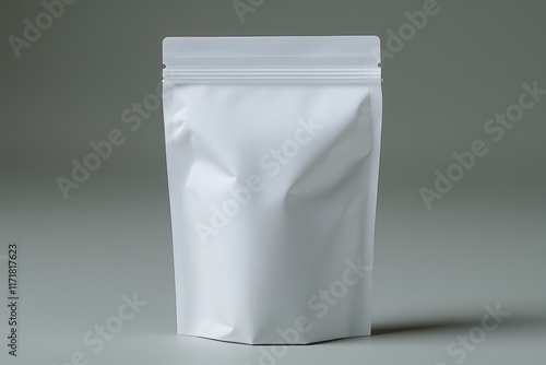 White stand-up pouch with a matte finish on a neutral gray background. modern food packaging and branding concept