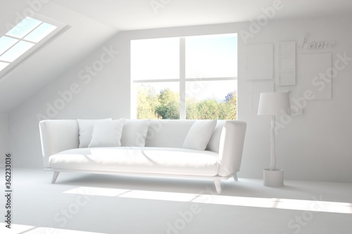 White stylish minimalist room with sofa and autumn landscape in window. Scandinavian interior design. 3D illustration