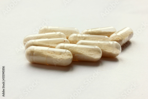 white tablets lie on a light background. Medical. Drug use. treatment. Home first aid kit. illness. antibiotics. Copy space for text. View from above.
