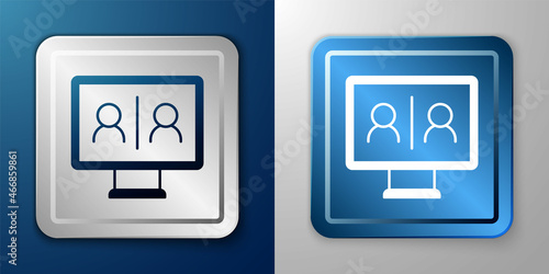 White Video chat conference icon isolated on blue and grey background. Online meeting work form home. Remote project management. Silver and blue square button. Vector