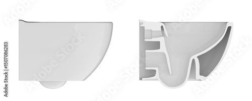 White wall mounted toilet bowl isolated on white background. Cross-sectional and side views of a toilet bowl. internal structure. 3d illustration