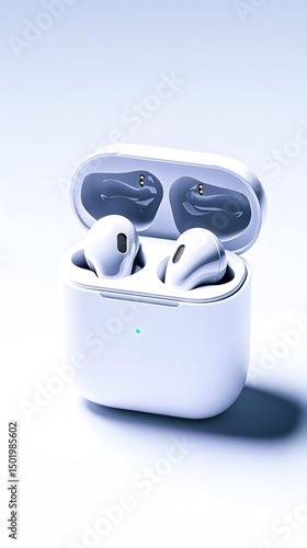 White wireless earbuds rest in their open charging case, on a light blue background; a small indicator light is visible