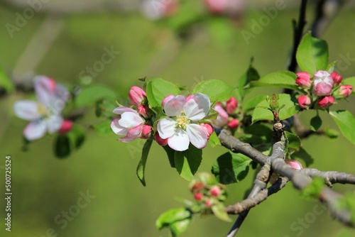 White-pink apple blossoms on a branch in spring