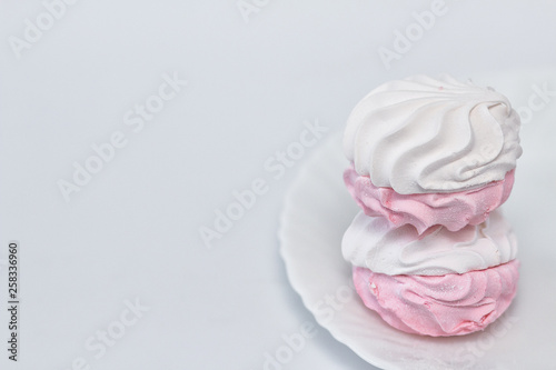 White-pink zephyr on a white plate on a white background.
