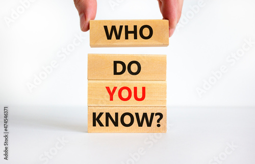 Who do you know symbol. Concept words Who do you know on wooden blocks. Businessman hand. Beautiful white table, white background, copy space. Business and Who do you know concept.