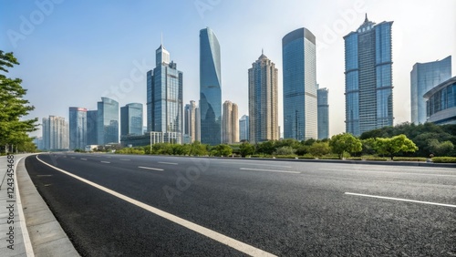 Wide asphalt road stretching through a modern cityscape with sleek skyscrapers and glass towers in the background, urban sprawl, cityscape, skyscraper, highway, modern city