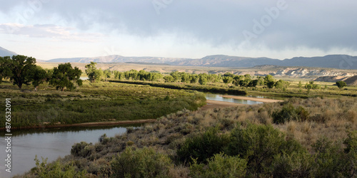Wide panorama of the Green River and riparian landscape with dry rain overhead at Browns Park National Wildlife Refuge in Colorado