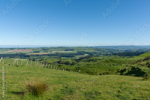 Wide view across rural farmland to distant coast