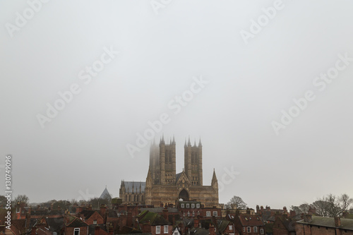 Wide view of Lincoln Cathedral, in the fog.