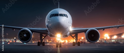 Wide-angle view of a modern commercial airplane on runway du sunset, illuminated engines and detailed fuselage with city lights in background