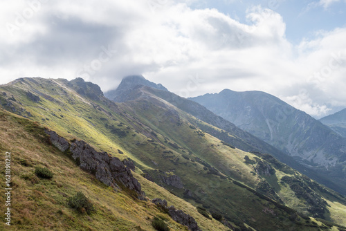 Widoki w Tatrach, z Kasprowego Wierchu czerwonym szlakiem do doliny Kondrackiej. Świnica w chmurach.