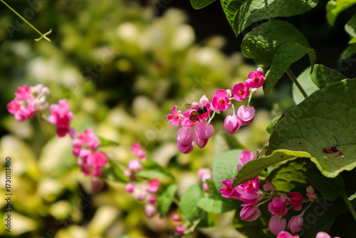 Wild bee looking for honey on a bloom Antigonon pink flower.