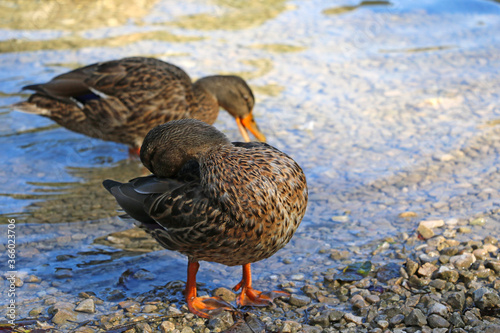 Wild duck cleaning feathers with the beak and splashing around in the water.