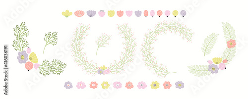 Wild flowers, grasses, ferns, decorative floral frames set, isolated on white. Hand drawn vector illustration. Clipart elements collection. Scandinavian style flat design. Concept for kids print