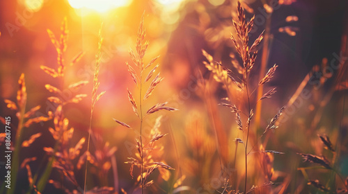 Wild grass in the forest in sunset. Macro image, shallow depth of field. Abstract nature background