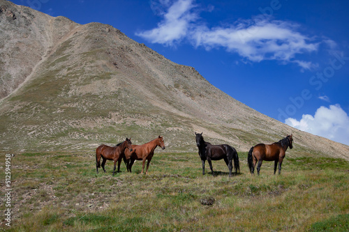 Wild horses in the Caucasus mountains. Elbrus region, Kabardino-Balkaria, Russia.