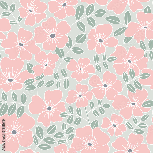 Wild rose floral doodle seamless pattern. Cute neutral summer blooming petals on delicate background. Gentle elegant romantic rosehip flower print for fabric or wrapping paper.