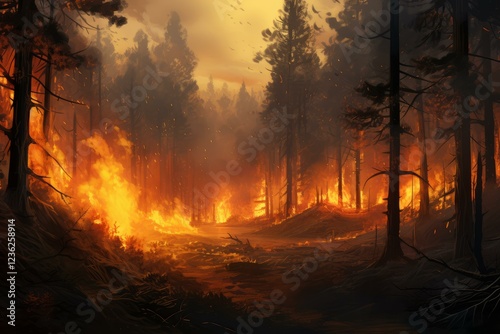 Wildfire burning through forest at dusk with birds escaping
