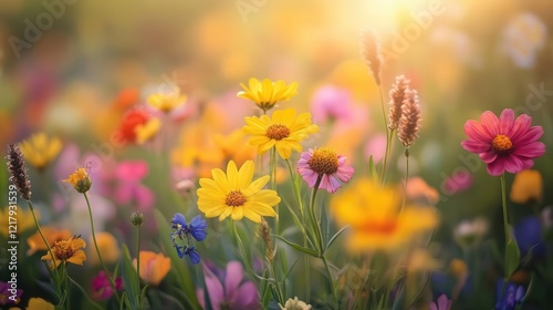 Wildflowers in meadow, close-up of colorful wildflowers swaying in the breeze, vibrant colors