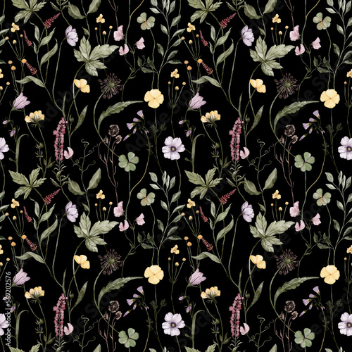 Wildflowers Seamless Pattern. Spring Flowers. Summer flowers. Floral Texture. Black Background