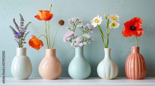 Wildflowers spreading fresh aroma in small vases photo. Elegant floral decor for house interior image background wallpaper. Minimalist flowers bouquets concept picture realistic