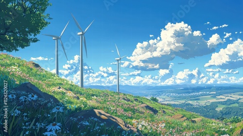 Wind Turbines Against a Beautiful Landscape with Cloudy Sky