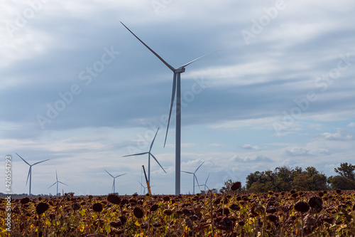 Wind turbines energy converters on yellow sunflowers field on the sunset. Local eco friendly wind farm. Agriculture crops harvest, farming harvesting background. Green ecological electricity wallpaper