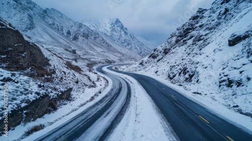 Winding Asphalt Road Through Snowy Mountains
